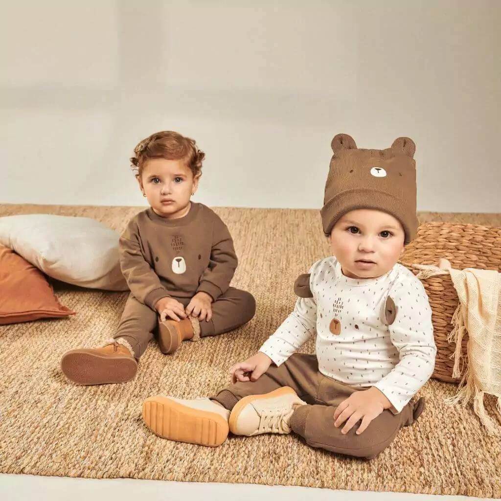 O body, confeccionado em cotton macio, possui manga longa para manter o bebê aquecido, fechamento por botões de pressão entre as pernas para facilitar a troca e uma estampa delicada com bordado e orelhinhas de ursinho, trazendo um toque lúdico e fofo. A calça, feita em molecotton, conta com cós elástico para um ajuste confortável e estampa de ursinho na parte de trás com orelhinhas aplicadas.